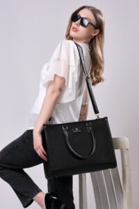 - * Fashionable Yet Functional: This laptop tote bag for women combines elegance and practicality. Expertly crafted with sophisticated canvas and PU fabric, it is not only stylish but also durable. The reinforced base and side padding provide extra protection while maintaining the bag’s shape and preventing spills. Protective studs on the base guard against dirt and wear, ensuring the bag stays in pristine condition.
